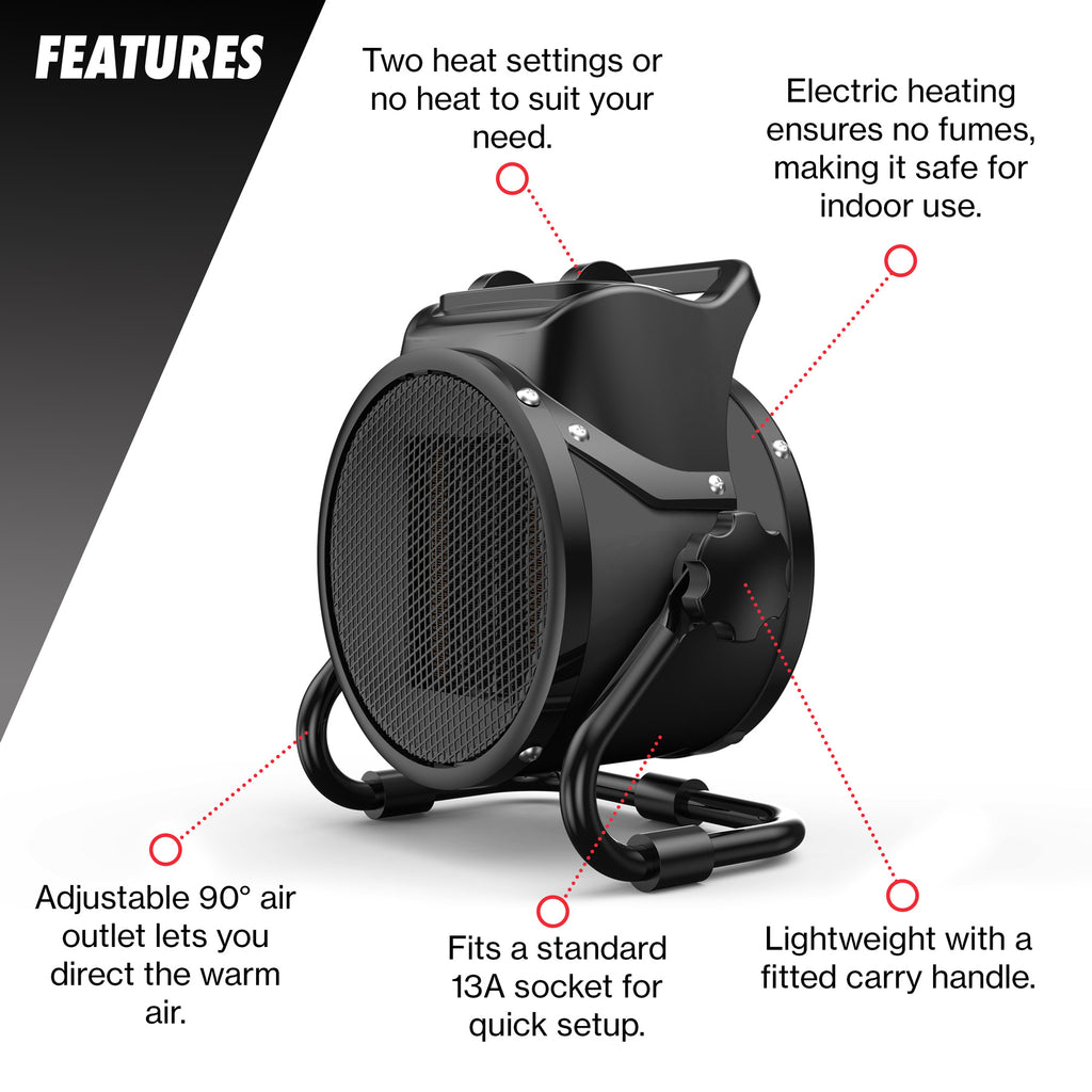 Our 2kW (6,800 BTU/hr) electric fan heater is the perfect choice for heating smaller spaces such as homes, offices, gyms, workshops, or caravans. With a heating capacity of up to 40m³, it distributes warmth quickly and evenly, ensuring comfort no matter the weather.