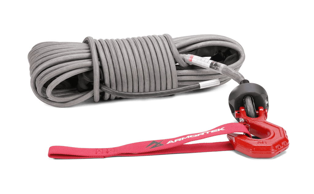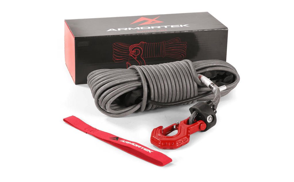This complete winch rope kit includes a high-strength 9.5mm x 25m Armortek Extreme Synthetic Rope, a heavy-duty hook, a rope stopper, and a handsaver strap, giving you everything you need for safe and reliable winching.