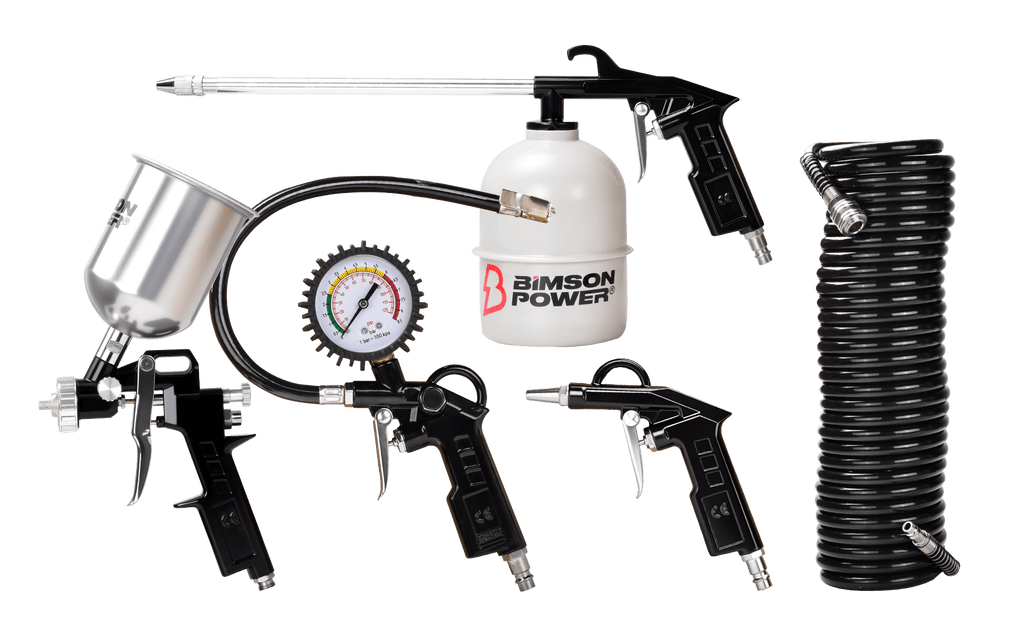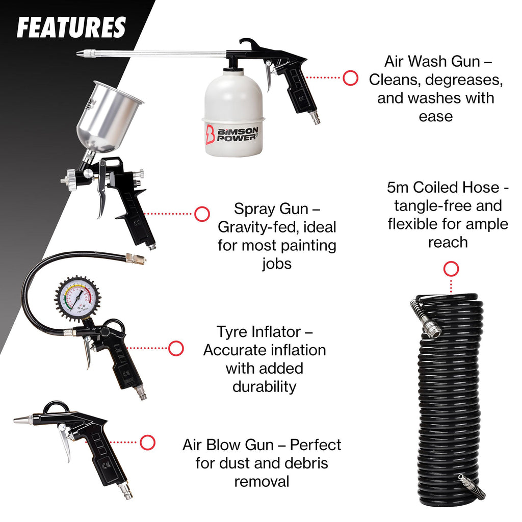 • Multi-Function Tools for Specific Jobs: Includes a gravity fed spray gun, air wash gun with steel pot, tyre inflator, and air blow gun—each tailored to specific applications from painting to cleaning, saving time and effort.