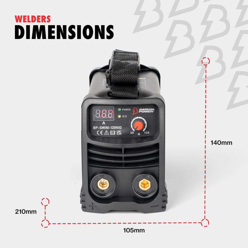 The Bimson Power BP-SMIN-120NID is a compact and lightweight MMA welder designed for professionals, hobbyists, and DIY enthusiasts who need a reliable and portable welding solution whether its indoor or outdoor. Operating on a standard 230V/13A power supply, this welder offers up to 120A output, capable of welding materials up to 5mm thick including low carbon steel and alloys.